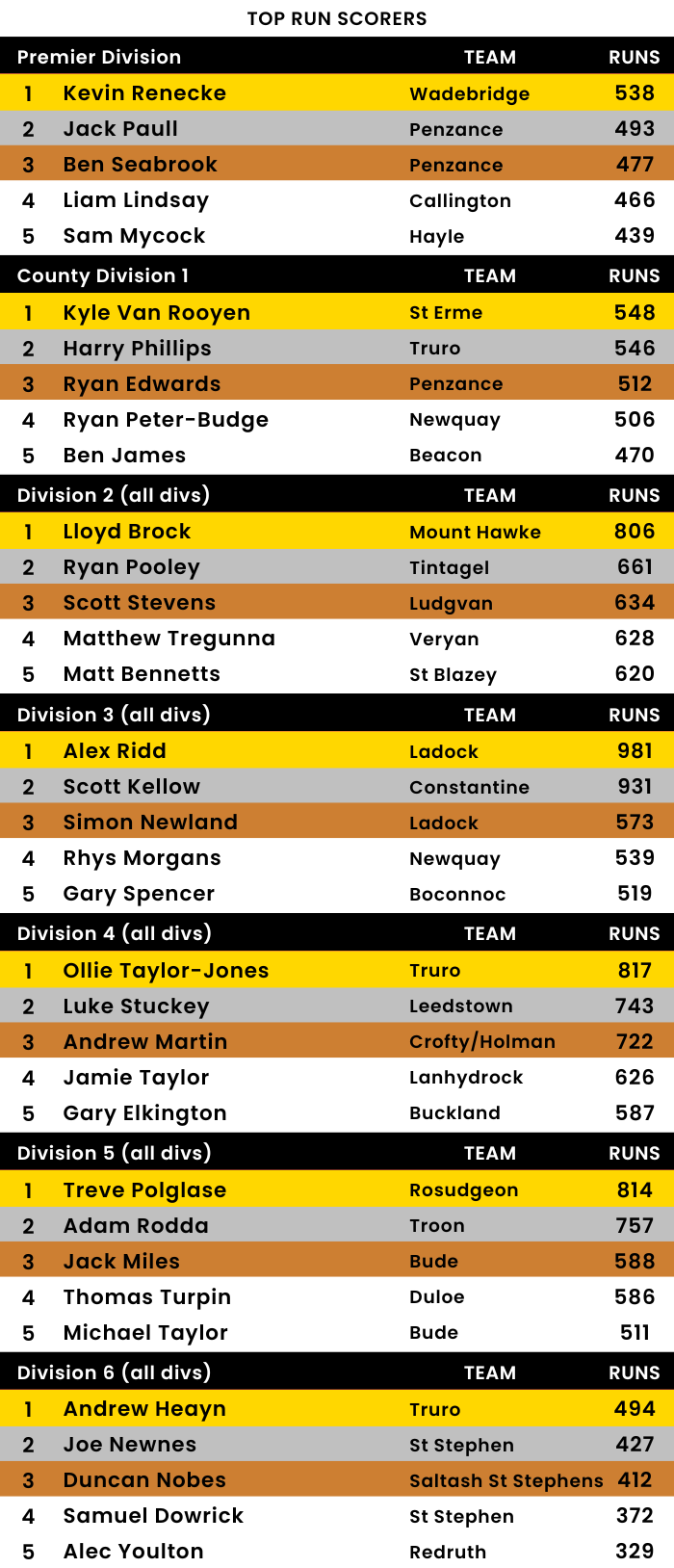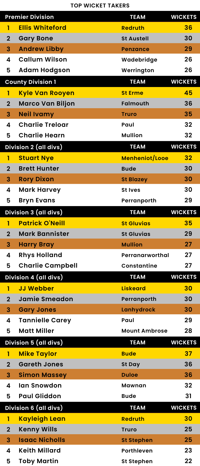 📊 Mount Ambrose 202-6 (M South 94, M Strick 53, D Paull 31; R Mitchell 2-21). Stithians 203-4 (R Burley 50, C Martin 43, N Kendall 42; S Johnson 2-33).