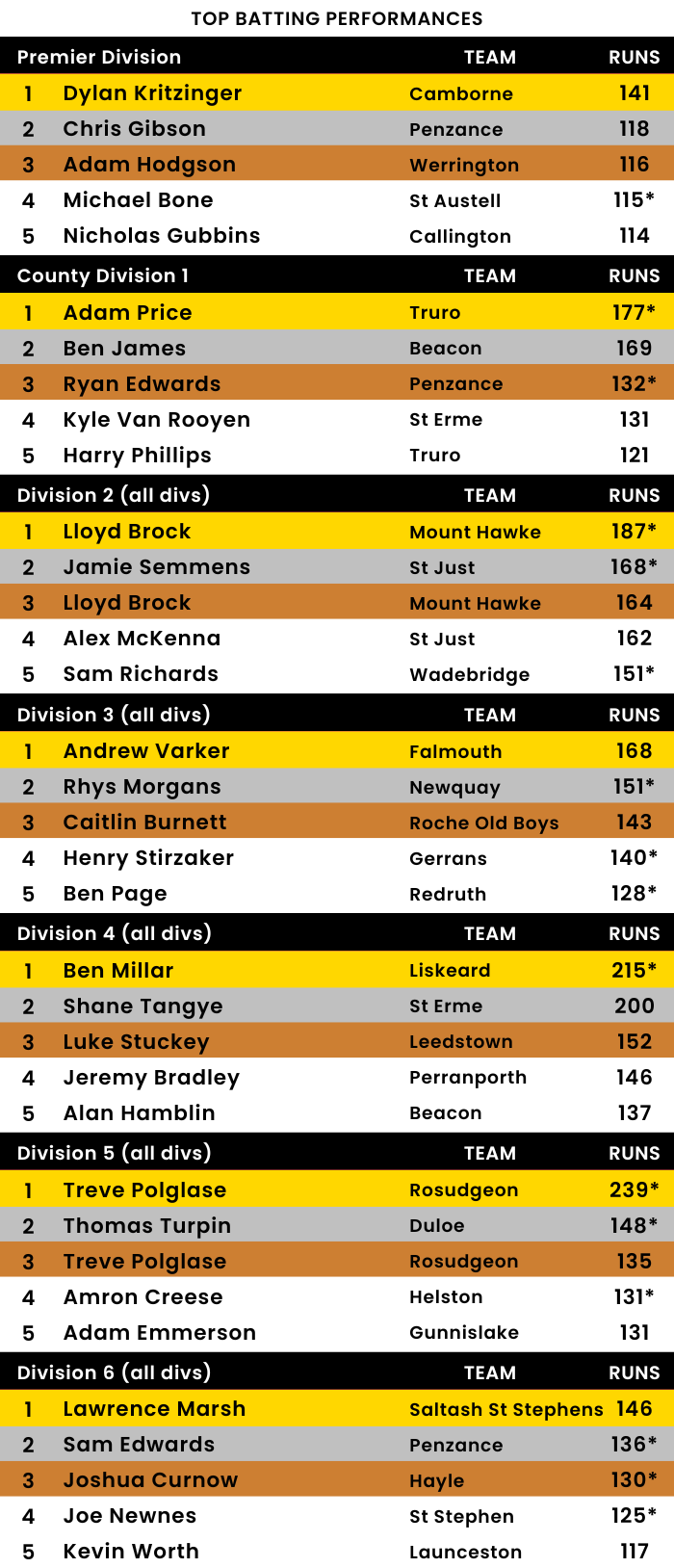 📊 Menheniot/Looe 153-8 (S Nye 29*, S Adams 26, P Nance 25; L Cole 3-30). Luckett 155-5 (M Southcott 33*, A Berry 32, M Brown 28; S Nye 3-26).