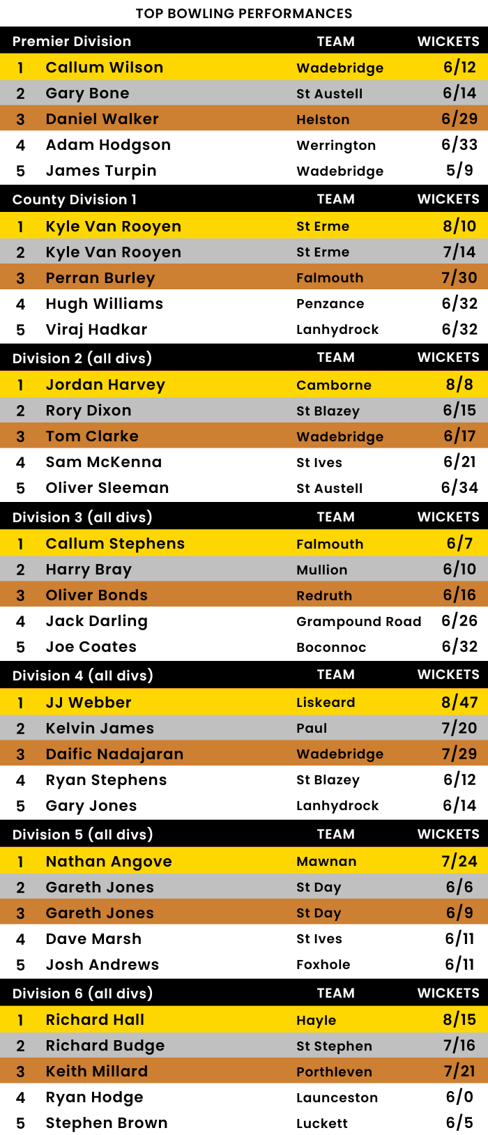 📊 South Petherwin 172 (M Bolt 67; H Daly 4-24, R Pooley 3-40). Tintagel 175-6 (R Pooley 68*, M Jolliffe 23, M Pethick 23; P Clements 2-21).